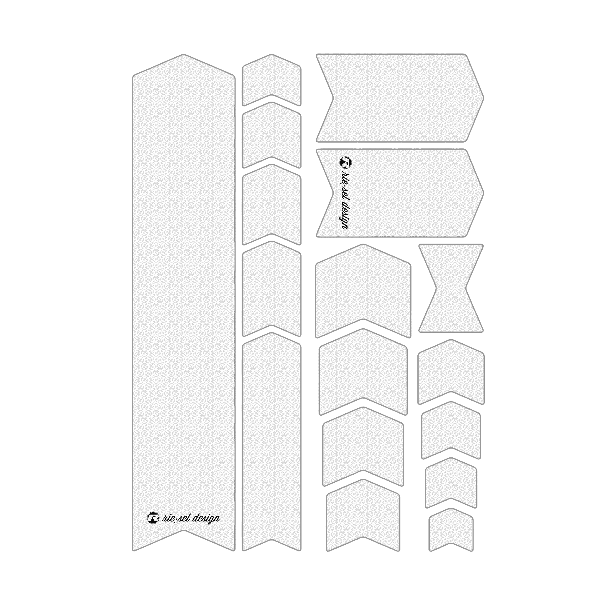 Die Größen unserer frame:TAPE3000 und frame:guard Shapes variieren zwischen 70 x 340 mm und 30 x 30 mm. Der extragroße Guard für das Unterrohr ist 70 x 340 mm groß. Die beiden größten Shapes für das Oberrohr messen 60 x 110 mm, das nächstgrößere Shape kommt 60 x 60 mm und dann werden sie jeweils um 5 mm kleiner. Die Shapes für das Sitzrohr sind jeweils 40 mm breit und variieren in der Länge zwischen 205 mm und 30 mm.